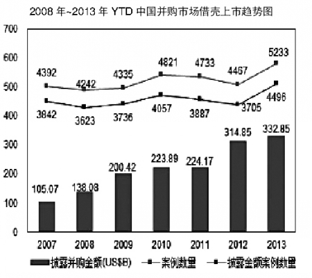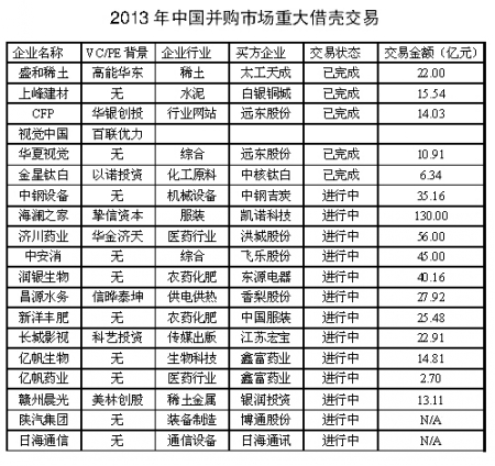 從并購類型來看,2013年借殼上市宣布案例達(dá)24起,總披露金額達(dá)177.79億美元,與去年同比分別增長71.43%、508.20%。其中海瀾之家服飾股份有限公司(簡稱“海瀾之家”)借殼凱諾科技曲線上市,交易規(guī)模達(dá)到130億元,并購規(guī)模列A股第五位。