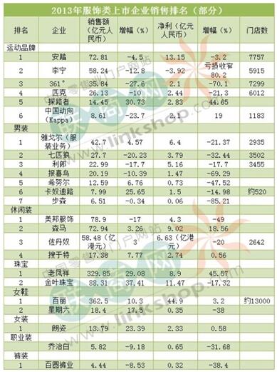 2014年的第一季度已經(jīng)結(jié)束,國內(nèi)多家服飾類上市公司已經(jīng)發(fā)布2013年度業(yè)績公告(部分企業(yè)為業(yè)績快報)。本網(wǎng)綜合整理了24家國內(nèi)服飾上市企業(yè)(包括鞋履和珠寶)的業(yè)績數(shù)據(jù),并根據(jù)銷售額進(jìn)行了分類排名。 從表單中可以看出,去年服飾業(yè)大環(huán)境仍然呈現(xiàn)蕭條景象,七成企業(yè)凈利潤下滑。曾經(jīng)叱咤整個中國市場的運動品牌普遍業(yè)績慘淡,李寧繼續(xù)虧損近4億元。在統(tǒng)計的七家男裝企業(yè)中,凈利更是無一增長。美邦服飾在去年下半年開始改造門店,推出O2O體驗店模式,但效果尚不明顯,凈利潤仍然下滑49%。 在一片“負(fù)分滾粗”的凄慘現(xiàn)狀中,也不乏逆勢而上的品牌。戶外用品品牌探路者的銷售業(yè)績和凈利潤,就雙雙出現(xiàn)較大幅度的增長。休閑品牌森馬也表現(xiàn)不俗,出現(xiàn)業(yè)績利潤的雙增長。而黃金珠寶品牌老鳳祥,或許是得益于去年“中國大媽”帶來的搶金潮,銷售額達(dá)到329.85億元,凈利潤增長45.57%。 具體業(yè)績數(shù)據(jù)及排名請看以下表單: