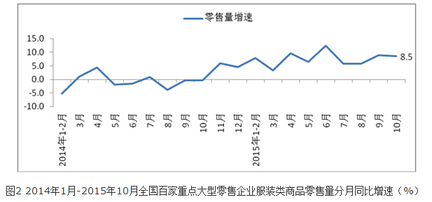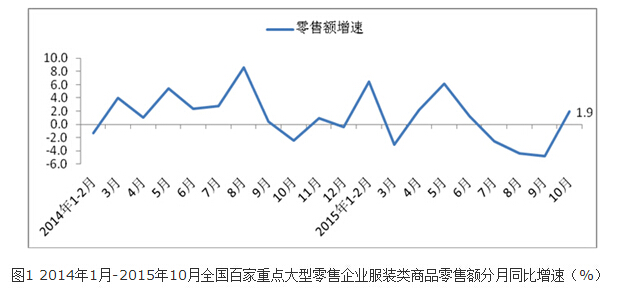 根據(jù)中華全國商業(yè)信息中心的統(tǒng)計(jì),2015年10月份全國百家重點(diǎn)大型零售企業(yè)服裝類商品零售額同比增長1.9%,扭轉(zhuǎn)了6月份以來連續(xù)三月增速下滑的局面,增速相比上年同期快4.4個(gè)百分點(diǎn),相比上月提高6.7個(gè)百分點(diǎn)。