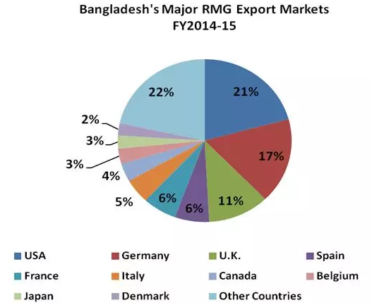 孟加拉成衣主要出口市場是歐盟和美國。其中,法國占出口的22%,法國占21%,德國占17%。
