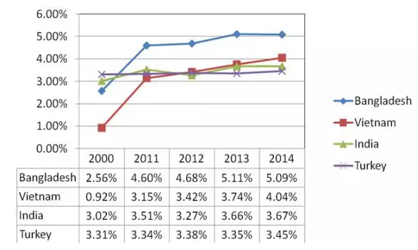 2000年,孟家拉成衣出口占全球總量的2.56%,2014年占5.09%。孟加拉在2000年就已超過土耳其和印度。若繼續(xù)增長8%,孟加拉成衣出口將突破500億美元大關(guān)。