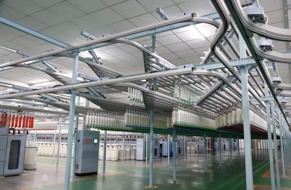粗紗輸送系統(tǒng)采用立體紗庫,上層為尾紗庫,下層為滿紗庫,立體設(shè)計,節(jié)省占地空間,粗紗直接開進細紗機紗架,取消傳統(tǒng)的上粗紗工。
