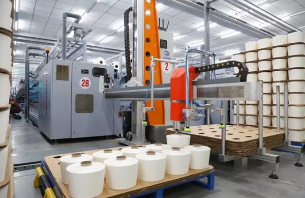 自動碼垛系統(tǒng)由智能化機械手臂抓取筒紗,減少筒紗形狀的破壞和污染,單個機械手臂可滿足7臺26錠的絡(luò)筒機。