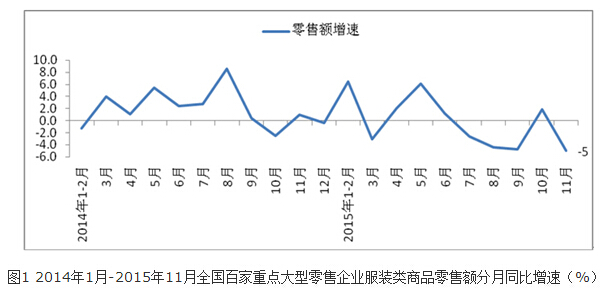 據(jù)中華全國商業(yè)信息中心的統(tǒng)計,2015年11月全國百家重點大型零售企業(yè)服裝類商品零售額同比下降5.0%,是今年以來的最低月度增速,增速相比上年同期下降5.9個百分點,相比上月下降6.9個百分點。