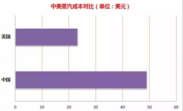 還有蒸汽部分,國內用熱電廠蒸汽,按每噸消耗蒸汽1.6噸、單價190元/噸計算,單位生產成本304元,折合49.0.美元,美國用天然氣鍋爐蒸汽,按天然氣價格為0.48美元/千卡、單價14.52美元/噸計算,單位生產成本23.23美元,國內比美國高出1.1倍。