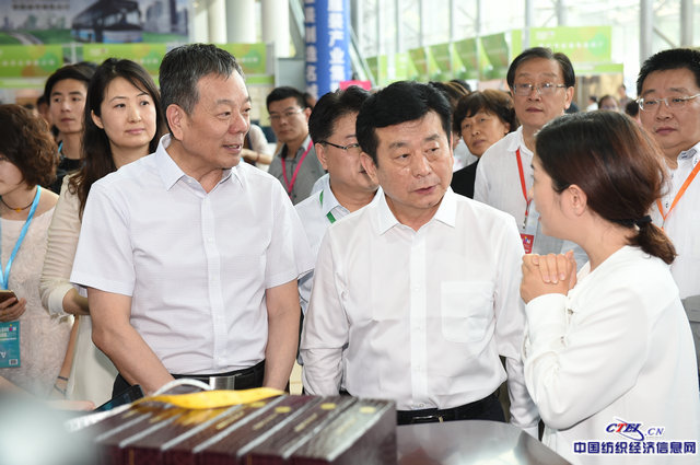 山東省副省長于曉明(中)與中國紡織工業(yè)聯(lián)合會(huì)副會(huì)長楊紀(jì)朝(左一)在參展商紅領(lǐng)集團(tuán)酷特展位