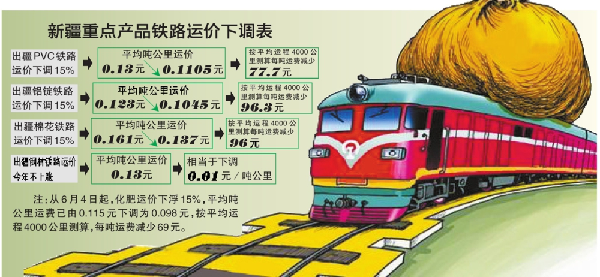 具體為:6月12日起,出疆聚氯乙烯(PVC)鐵路運價下調(diào)15%,平均噸公里運價由0.13元下調(diào)到0.1105元。按照平均運程4000公里測算,每噸運費減少77.7元。