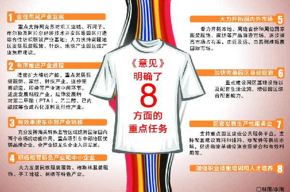 《意見》從加大財政、金融支持力度等角度提出6項政策措施。一是實施財政支持政策。加大中央財政對新疆紡織服裝產業(yè)發(fā)展的投入力度。二是推動新疆特別是南疆地區(qū)落實紡織服裝企業(yè)吸納就業(yè)困難人員社會保險補貼,及崗前就業(yè)技能培訓補貼政策。三是國家繼續(xù)實施出疆棉紡織品運費補貼政策,并擴大到服裝家紡等深加工產品。支持新疆開通國際貨運班列。四是改善園區(qū)生產經營環(huán)境,降低企業(yè)用電、用氣成本,專項資金支持標準廠房建設等。五是加大金融支持力度,擴大紡織服裝產業(yè)信貸規(guī)模,創(chuàng)新金融服務模式,支持金融機構在新疆設立更多分支機構,適度擴大新疆金融機構貸款審批權限。六是健全地方配套政策,做好水、電、熱供應和污水集中處理等公共服務,同時防止產能過度擴張。