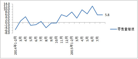 圖2 2014年1月-2015年8月全國(guó)百家重點(diǎn)大型零售企業(yè)服裝類商品零售量分月同比增速(%)