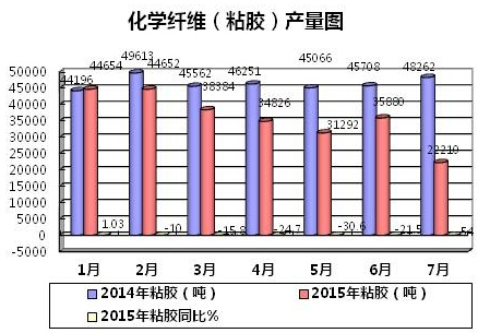 1、化纖(粘膠纖維)。2015年1-7月份,化纖企業(yè)累計(jì)生產(chǎn)粘膠纖維267198噸,同比下降18.4%,環(huán)比下降38.1%。