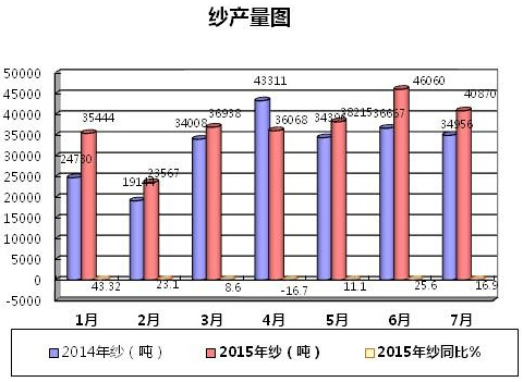 1、棉紡織。據(jù)自治區(qū)統(tǒng)計(jì)局?jǐn)?shù)據(jù)(以下同),2015年1-7月份,我區(qū)規(guī)模以上棉紡織企業(yè)累計(jì)生產(chǎn)棉紗25.94萬噸,同比增長(zhǎng)19.5%,環(huán)比則下降了11.27%;累計(jì)生產(chǎn)棉布2223.3萬米,同比增長(zhǎng)2.2%,環(huán)比增長(zhǎng)1.47%。
