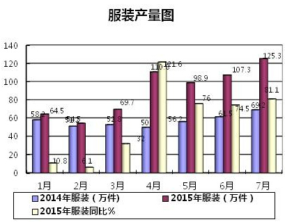 2015年1-7月份,我區(qū)規(guī)模以上服裝企業(yè)累計(jì)生產(chǎn)服裝631萬件,同比增長(zhǎng)58.1%,環(huán)比增長(zhǎng)16.72%。