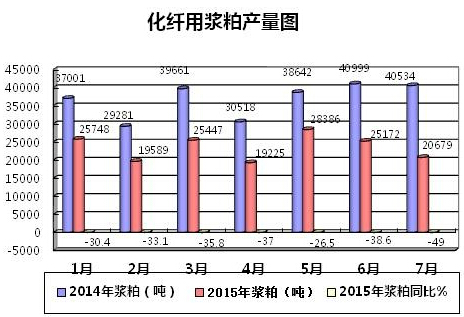 2、化纖用棉漿粕。2015年1-7月份,累計(jì)生產(chǎn)化纖用棉漿粕193525噸,同比下降35.9%,環(huán)比下降17.85%。