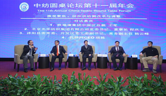 1月17日下午,以“‘十三五’紡織供給側(cè)改革調(diào)整”為主題的中國紡織圓桌論壇第十一屆年會,在北京順利召開。會議邀請了歐瑞康集團(tuán)中國區(qū)總裁王軍,北京光華紡織集團(tuán)有限公司黨委書記、董事長程慶寶,沭陽縣委常委、開發(fā)區(qū)黨工委副書記楊云峰,找紗網(wǎng)CEO頊棟等不同行業(yè)、不同企業(yè)嘉賓從微觀層面談供給側(cè)改革與調(diào)整。這是長短結(jié)合的國家政策,它將如何實(shí)現(xiàn),怎樣落地,不同集群也都有各自不同的聲音。四位對話嘉賓從不同的角度就主題問題發(fā)表了各自的看法,這也是一次高端平臺上的探討和探索。