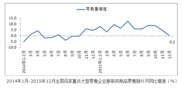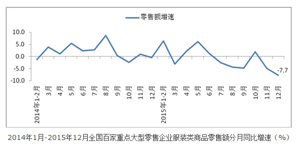 根據(jù)中華全國(guó)商業(yè)信息中心的統(tǒng)計(jì)數(shù)據(jù),2015年1-12月,全國(guó)重點(diǎn)大型零售企業(yè)服裝商品零售額同比下降0.3%,增速較2014年下滑1.3個(gè)百分點(diǎn);其中,2015年12月份,全國(guó)百家重點(diǎn)大型零售企業(yè)服裝商品零售額同比下降7.7%,增速較上月低2.7個(gè)百分點(diǎn),創(chuàng)年內(nèi)最大月度跌幅。