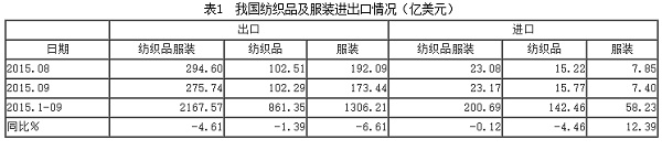 根據(jù)中國(guó)海關(guān)的統(tǒng)計(jì)數(shù)據(jù),我國(guó)2015年1-9月份紡織品及服裝出口總額2167.57億美元,同比減少4.61%,占全國(guó)商品出口總額16641.20億美元的13.03%;其中1-9月份紡織品出口總額861.35億美元,同比減少1.39%,占紡織品及服裝出口總額2167.57億美元的39.74%;1-9月份服裝出口總額1306.21億美元,同比減少6.61%,占紡織品及服裝出口總額2167.57億美元的60.26%;