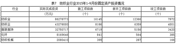 據(jù)報(bào)道,2015年1-9月份紡織全行業(yè)實(shí)際完成投資額8627.88億元,同比增加15.68%;當(dāng)年以來(lái)到目前為止施工項(xiàng)目總數(shù)為16145個(gè),同比增加6.01%;其中新開工項(xiàng)目數(shù)12366個(gè),同比增加13.68%;截至9月底為止,已實(shí)現(xiàn)竣工項(xiàng)目數(shù)7972個(gè),同比增加13.22%,占施工項(xiàng)目總數(shù)的49.38%,表明該行業(yè)投資項(xiàng)目進(jìn)展較好。