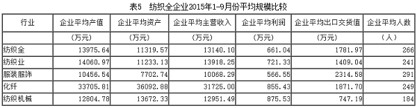從企業(yè)平均規(guī)模的比較看,2015年1-9月份紡織全行業(yè)的企業(yè)平均產(chǎn)值為13976萬(wàn)元,其中紡織行業(yè)企業(yè)平均產(chǎn)值為14061萬(wàn)元,為紡織全行業(yè)平均數(shù)的1.006倍;服裝服飾行業(yè)為10457萬(wàn)元,為紡織全行業(yè)平均數(shù)的0.75倍;化纖行業(yè)為33706萬(wàn)元,為行業(yè)平均數(shù)的2.41倍;紡織機(jī)械行業(yè)為12805萬(wàn)元,為行業(yè)平均數(shù)的0.92倍,表明化纖行業(yè)的企業(yè)平均規(guī)模較大,而服裝服飾等行業(yè)的企業(yè)平均規(guī)模較小一些。
