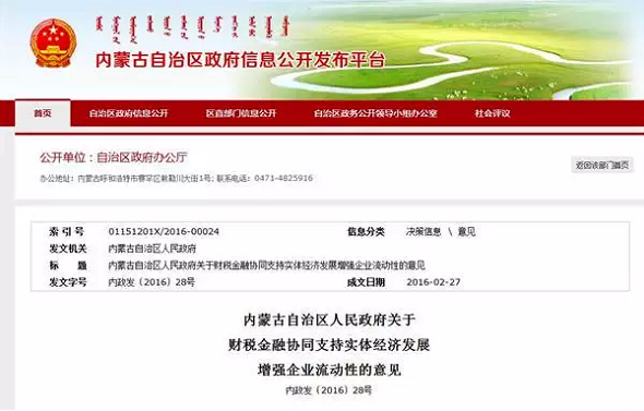 2、2月27日內(nèi)蒙古自治區(qū)人民政府發(fā)布關(guān)于財稅金融協(xié)同支持實體經(jīng)濟發(fā)展增強企業(yè)流動性的意見