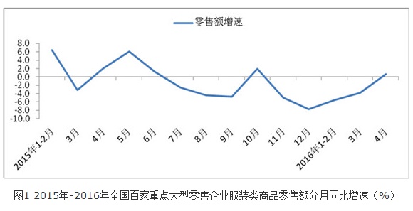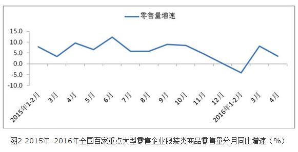 2016年4月全國百家重點大型零售企業(yè)各類服裝銷量同比增長3.5%,低于上年同期6.1個百分點,低于上月4.7個百分點。