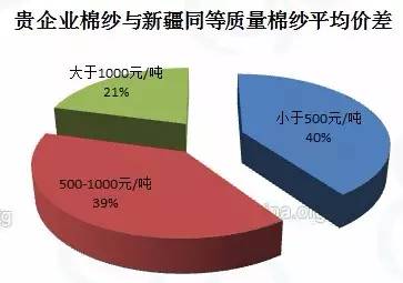 新疆棉紗之所以能在近兩年迅速崛起,確實(shí)因?yàn)槠溆忻黠@的價(jià)格優(yōu)勢(shì)。調(diào)查結(jié)果表明,約四成的紡織企業(yè)表示同等質(zhì)量的每噸棉紗,與新疆棉紗價(jià)格差距約在500至1000元之間;另有四成的企業(yè)表示價(jià)差稍微小點(diǎn),在500元以下;21%的企業(yè)則表示新疆棉紗價(jià)格實(shí)在太低,兩者相比,甚至有1000元以上的差距。