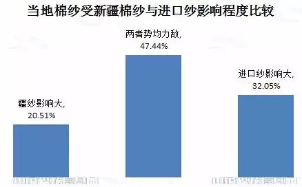 在內(nèi)地棉紗市場(chǎng),新疆棉紗與進(jìn)口棉紗兩股力量進(jìn)行激烈地博弈。據(jù)調(diào)查,有21%的企業(yè)表示新疆棉紗已超過(guò)進(jìn)口紗,成為內(nèi)地棉紗的第一競(jìng)爭(zhēng)者;約47%的被調(diào)查企業(yè)反映新疆棉紗和進(jìn)口棉紗對(duì)當(dāng)?shù)孛藜喌挠绊憚?shì)均力敵,32%的企業(yè)表示仍然是進(jìn)口紗影響程度大。