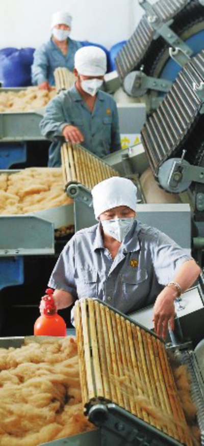 6月6日,在新疆玉泰駝絨紡織品有限公司的生產(chǎn)線上,工人們正在對駝毛進(jìn)行加工。