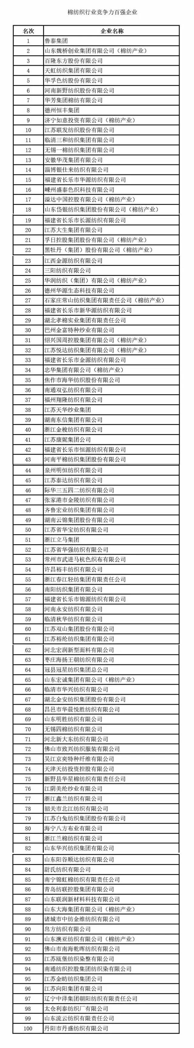 “棉紡織行業(yè)競爭力百強企業(yè)”獲獎名單