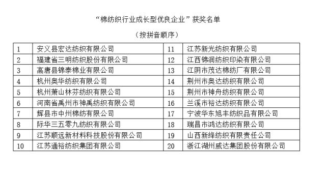 “棉紡織行業(yè)成長型優(yōu)良企業(yè)”獲獎名單