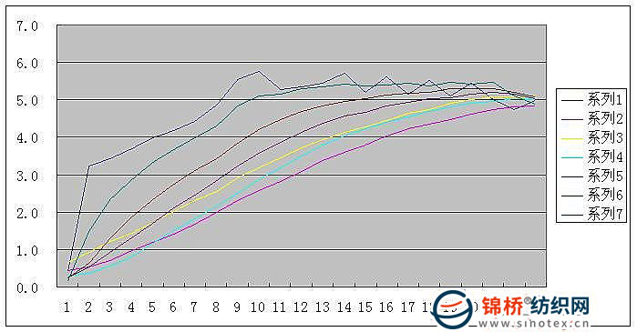 ①在表列時(shí)間跨度為連續(xù)的46h之內(nèi),各探頭所處位置的溫度由7℃左右陸續(xù)上升到12℃左右,各探頭的溫度隨時(shí)間的變化曲線如圖2所示。圖2中,橫軸為時(shí)間,單位為2H,縱軸為溫度,單位為℃,為便于觀察,將溫度值統(tǒng)一減7,僅呈現(xiàn)變化量。系列1曲線表示環(huán)境溫度,系列2~系列7依次表示1號(hào)~6號(hào)探頭所處位置的溫度變化曲線。