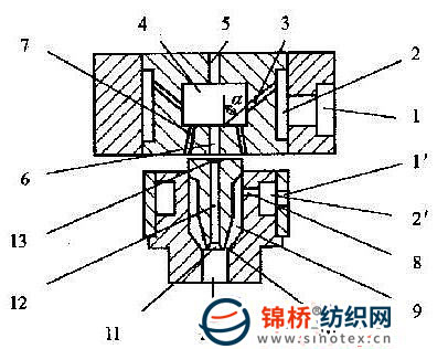 申請(qǐng)(專(zhuān)利權(quán))人:東華大學(xué) 發(fā)明(設(shè)計(jì))人:程隆棣;祝章琛;于修業(yè);勞繼紅;江慧;薛文良 主權(quán)項(xiàng):一種噴氣渦流紡復(fù)式加捻器,它包括進(jìn)氣口(1)、纖維入口(5)、排氣口(7)、出紗口(14)。其特征是由上部加捻器還包括貯氣室(2)、噴嘴(3)、渦流腔(4)、須條出口(6)和下部加捻器還包括貯氣室(2)、通道(8)、環(huán)形腔(9)、收縮管(10)、輸氣通道口(11)、進(jìn)氣通道(12)、須條入口(13)共同組成。上部加捻器與下部加捻器通過(guò)須條出口(6)和須條入口(13)的接口連成一整體,其整體安裝在紡紗機(jī)牽伸區(qū)和卷繞區(qū)之間的機(jī)架上。 |