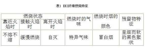 EKS纖維是日本東洋紡公司最近推出的一種能隨外界環(huán)境和穿著空間變化,而自創(chuàng)舒適穿著感覺(jué)的呼吸纖維,這種纖維的創(chuàng)造理念是“提供為人們營(yíng)造舒適生活的功能纖維”。EKS纖維不僅可調(diào)節(jié)人體與服裝之間的溫度及濕度,還具有保護(hù)人體與環(huán)境的功能。在寒冷的冬季穿著EKS纖維制品,利用其吸汗并產(chǎn)生吸附熱量的功能,使人體與服裝之間的溫度升高,而感到溫暖舒適。傳統(tǒng)的保溫是以阻止身體所產(chǎn)生的熱量逃逸為主,EKS纖維制品則是自行發(fā)熱而溫暖身體的種全新材料。該纖維不僅在吸濕性能方面遠(yuǎn)遠(yuǎn)超過(guò)了天然纖維,還具有吸濕、發(fā)熱、控制pH值、阻燃、抗起球和防靜電等多種功能。已經(jīng)在服裝、家紡和產(chǎn)業(yè)領(lǐng)域得到廣泛應(yīng)用[1]。但是EKS纖維的定性鑒別,目前沒(méi)有列入相關(guān)標(biāo)準(zhǔn)。本文采用燃燒法、顯微鏡法、溶解法、紅外吸收光譜法以及熔點(diǎn)法對(duì)EKS纖維的鑒別進(jìn)行了試驗(yàn)研究,提出了較為實(shí)用、快速有效的鑒別方法。 1試驗(yàn) 原料:EKS纖維由海寧伊利特制衣有限公司提供。 試劑:硫酸、鹽酸、硝酸、甲酸、N,N一二甲基甲酰胺(DMF)、氫氧化鈉、乙酸乙酯、苯酚四氯乙烷、硫氰酸鈉、石臘油、火膠棉、三級(jí)水、氨水等。 儀器:纖維細(xì)度儀(可放大1000倍)、傅立葉紅外光譜儀、偏光顯微熔點(diǎn)儀、染色小樣機(jī)、哈氏切片器、250mL燒杯、250mL三角燒瓶、玻璃棒等。 試驗(yàn)方法:分別采用燃燒法、顯微鏡法、溶解法、紅外吸收光譜法以及熔點(diǎn)法對(duì)EKS纖維進(jìn)行定性分析。 2試驗(yàn)結(jié)果及分析 2.1燃燒法 燃燒法是根據(jù)纖維靠近火焰、接觸火焰和離開火焰時(shí)的狀態(tài)及燃燒時(shí)產(chǎn)生的氣味及顏色和燃燒后殘留物特征來(lái)辯別纖維的類別的方法。EKS纖維燃燒特征如表1所示。