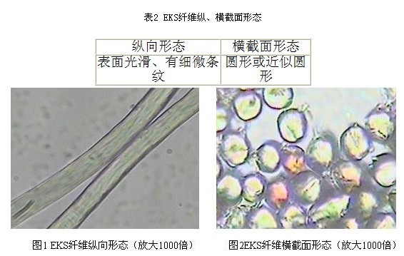 從表1可以發(fā)現(xiàn),EKS纖維在靠近火焰時(shí)不熔不縮,在火焰中燃燒時(shí)為緩慢燃燒且冒白煙,并釋放出一種特異氣味,在離開火焰時(shí)自滅。其殘留的特征為細(xì)而軟的黑色絮狀物。因此我們可以發(fā)現(xiàn),EKS纖維在燃燒過(guò)程中的形態(tài)是有別于我們標(biāo)準(zhǔn)中所涉及的纖維在燃燒過(guò)程中的形態(tài)的。 2.2顯微鏡法 顯微鏡法是用顯微鏡觀察未知纖維的縱面和橫截面形態(tài),對(duì)照纖維標(biāo)準(zhǔn)照片和形態(tài)描述來(lái)鑒別未知纖維的類別的方法。 縱面制片:將整理好的適量纖維,嵌于哈氏切片器凹槽中,切取一定長(zhǎng)度的纖維并提取少量置于載玻片上,滴上石蠟油,覆上蓋玻片,在顯微鏡下觀察纖維縱向形態(tài)。 橫截面制片:將整理好的適量纖維,嵌于哈氏切片器凹槽中,先用單面刀片把纖維切平然后用火棉膠輕涂于纖維表面使之凝固,用單面刀片切取10μm~3Oμm的薄片,在顯微鏡下觀察纖維橫截面形態(tài)。 縱面和橫截面所觀察到的形態(tài)如表2和圖1、圖2所示。