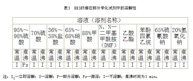 從圖1可以看出EKS纖維的縱向形態(tài)表面光滑,且有細(xì)微的條紋;從圖2可以看出,EKS纖維的橫裁面為圓形或近似圓形,跟絕大部份的化纖形態(tài)接近。 2.3溶解法 溶解法是利用纖維在不同溫度下的不同化學(xué)試劑中的溶解特性來(lái)鑒別纖維的方法。EKS纖維的溶解特性見(jiàn)表3。
