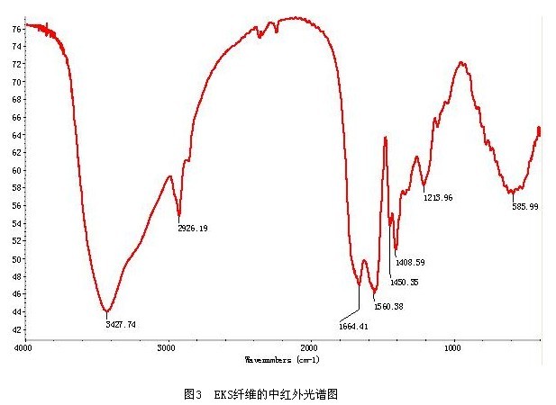 從表3可以看出EKS纖維即不溶解于強(qiáng)酸中,也不溶解于強(qiáng)堿中,在常用于纖維定性的有機(jī)溶劑中也無(wú)法溶解,說(shuō)明EKS纖維結(jié)構(gòu)穩(wěn)定化學(xué)穩(wěn)定性也非常好。 2.4紅外光譜法 當(dāng)纖維分子中某個(gè)基團(tuán)的振動(dòng)頻率跟紅外光頻率一樣時(shí)分子就要吸收能量。紅外光譜圖就是通過(guò)吸收峰的位置,相對(duì)強(qiáng)度以及峰的形狀提供化合物的結(jié)構(gòu)信息。EKS纖維是由高分子材料組成,所以也適合用于紅外光譜法進(jìn)行定性分析。 測(cè)試條件和方法:掃描32次,分辨率4cm-1,光譜范圍400cm-1~4000cm-1,采用ITR附件,對(duì)光譜進(jìn)行自動(dòng)基線校正處理。測(cè)試時(shí),將織物拆成紗線置于晶體(硒化鋅ZnSe)材料上方,采用點(diǎn)對(duì)點(diǎn)采樣技術(shù),適當(dāng)旋緊ITR附件固定鈕,使纖維與晶體材料緊密接觸,紅外光束在晶體內(nèi)發(fā)生衰減全反射后,通過(guò)纖維的反射信號(hào)獲得其有機(jī)成分的結(jié)構(gòu)信息,用計(jì)算機(jī)軟件得到樣品的紅外吸收光譜圖(見(jiàn)圖3)。