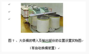 1、現(xiàn)在國際上在頭道并條機(SB-D22雙眼并條機)上也采用了直徑1000毫米及高度為1200毫米高的大條桶,使每年的換桶次數(shù)減少了4萬次,每天可減少100多次換桶。不僅減少了換桶運桶次數(shù),而切減大少了結頭次數(shù)大的提高了并條機的效率及質(zhì)量。如圖5