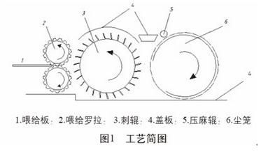 制樣機(jī)的工藝簡圖如圖1所示。精干麻切斷成一定的長度,人工將一定量的切斷麻均勻地平鋪在喂給板1上,精干麻由一對溝槽羅拉2積極握持,上溝槽羅拉由彈簧加壓與下溝槽羅拉嚙合,因而能牢牢地握持住精干麻,并以溝槽羅拉的線速度向刺輥3喂入。刺輥的表面包覆著針布,刺輥表面的線速度遠(yuǎn)遠(yuǎn)超過喂給羅拉的線速度,送入的精干麻受到高速回轉(zhuǎn)且轉(zhuǎn)動慣量很大的刺輥的開松梳理,大部分的束絲、并絲被分離成單纖維的狀態(tài)。經(jīng)開松、梳理過的纖維在塵籠6的負(fù)壓作用下吸附在其表面上,塵籠在電動機(jī)的帶動作用下轉(zhuǎn)動輸出纖維網(wǎng)。