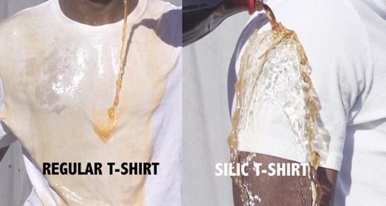原來,這種T恤的材料以二氧化硅為主,其纖維上包含了數(shù)以萬計的硅石微粒。液體類物質(zhì)一旦碰到它,就會形成球狀并滾落。也就是說,穿上這件衣服,你在食用可樂、番茄沙司、紅酒這類食物時不用在小心翼翼的了。