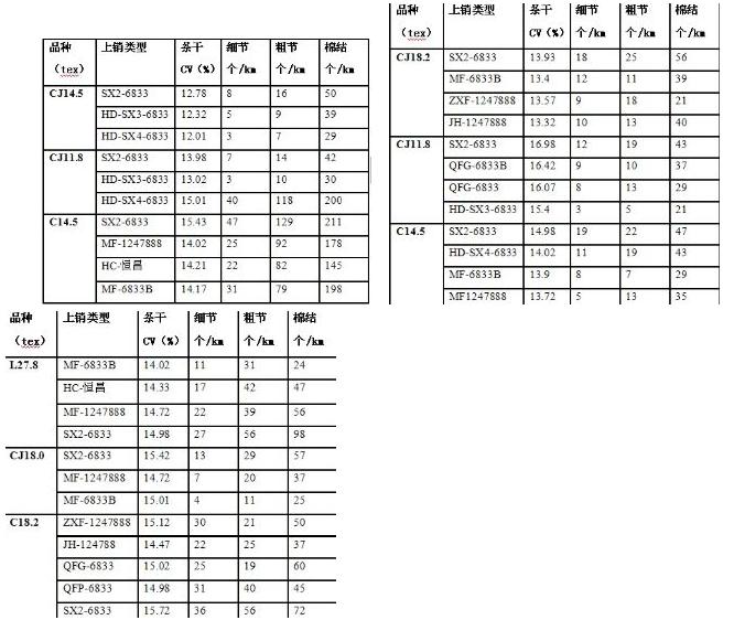 我們分別使用國產(chǎn)生產(chǎn)的MF型、HC型、ZXF型、JH型、QFG型、QFP型、HD-SX3、QS-142、HD-SX4九種尼龍上銷和普通SX2-6883型金屬鐵板上銷紡制不同型號的紗線,并使用Uster-x型條干均勻度儀進(jìn)行測試,測試溫度為20攝氏度,相對濕度60%。我們在生產(chǎn)現(xiàn)場采樣,每組試樣個數(shù)和次數(shù)均按國家有關(guān)標(biāo)準(zhǔn)規(guī)定執(zhí)行。在改變上銷的試驗(yàn)中,采用同臺同粗紗同錠對比取樣,以保證所測試的數(shù)據(jù)間的可比性。