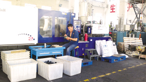 圖為公司工人在車間批量生產(chǎn)尼龍調(diào)節(jié)架。