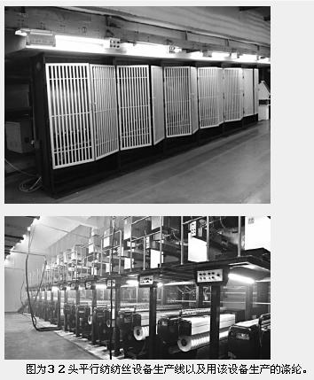 圖為32頭平行紡紡絲設(shè)備生產(chǎn)線以及用該設(shè)備生產(chǎn)的滌綸。