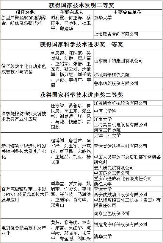 1月9日,2014年度國(guó)家科學(xué)技術(shù)獎(jiǎng)勵(lì)大會(huì)在北京舉行,大會(huì)共授獎(jiǎng)318項(xiàng)成果、8位科技專(zhuān)家和1個(gè)外國(guó)組織。紡織行業(yè)共有6個(gè)項(xiàng)目獲獎(jiǎng),其中,獲國(guó)家科學(xué)技術(shù)進(jìn)步一等獎(jiǎng)一項(xiàng),國(guó)家科學(xué)技術(shù)進(jìn)步二等獎(jiǎng)四項(xiàng),國(guó)家技術(shù)發(fā)明二等獎(jiǎng)一項(xiàng)。由山東康平納集團(tuán)有限公司、機(jī)械科學(xué)研究總院、魯泰紡織股份有限公司聯(lián)合完成的“筒子紗數(shù)字化自動(dòng)染色成套技術(shù)與裝備”獲得國(guó)家科學(xué)技術(shù)進(jìn)步(通用項(xiàng)目)一等獎(jiǎng)。這是繼2009年后,時(shí)隔5年,紡織行業(yè)再次獲得國(guó)家科學(xué)技術(shù)進(jìn)步一等獎(jiǎng);也是2000年以來(lái)紡織行業(yè)第四次獲得一等獎(jiǎng)。 “康平納模式”引領(lǐng)紡機(jī)項(xiàng)目獲重獎(jiǎng) 6個(gè)獲獎(jiǎng)項(xiàng)目中,有兩項(xiàng)是紡織機(jī)械裝備類(lèi)項(xiàng)目,除一等獎(jiǎng)“筒子紗數(shù)字化自動(dòng)染色成套技術(shù)與裝備”外,由江蘇凱宮機(jī)械股份有限公司、中原工學(xué)院、江南大學(xué)、上海昊昌機(jī)電設(shè)備有限公司、河南工程學(xué)院聯(lián)合完成的“高效能棉紡精梳關(guān)鍵技術(shù)及其產(chǎn)業(yè)化應(yīng)用”項(xiàng)目獲得國(guó)家科學(xué)技術(shù)進(jìn)步二等獎(jiǎng)?! ?/p>