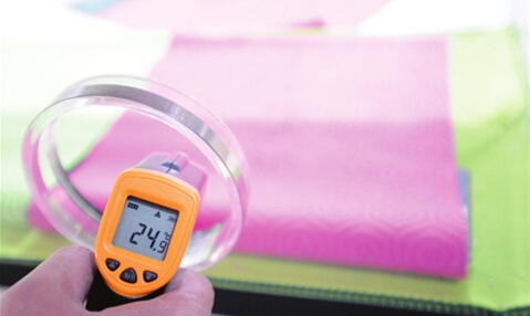 在明大永業(yè)的產(chǎn)品展廳內(nèi),記者見(jiàn)到了一只專門用于測(cè)試的透明玻璃箱,箱內(nèi)并排放著粉紅色、綠色兩塊相似的面料。在12只射燈持續(xù)均勻照射5分鐘后,測(cè)溫槍顯示,粉紅色面料溫度為24.9℃,綠色面料為27.9℃;照射10分鐘后,粉紅色面料溫度不變,綠色面料則上升為29.9℃。