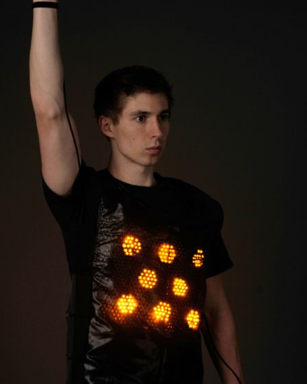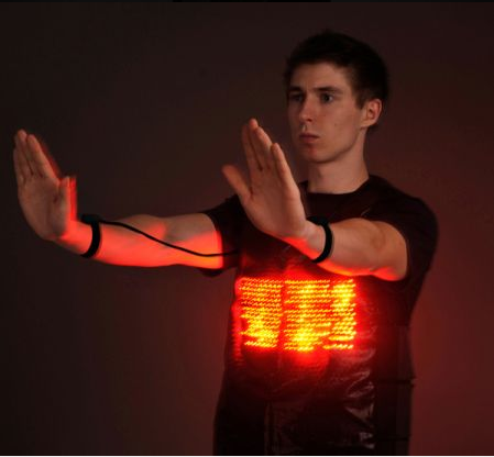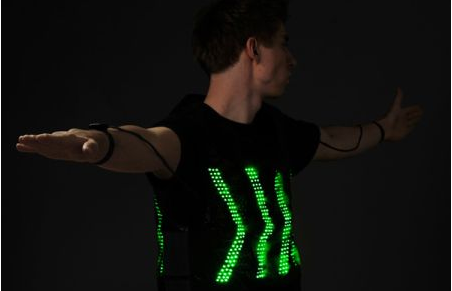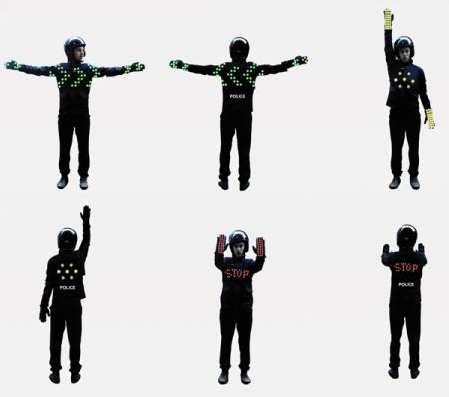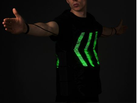 這款帶有LED燈的背心,可以根據穿著者的手勢動作顯示出不同的交通指示標識。燈光與紅綠燈一樣分為紅、黃、綠三種顏色,搭配手勢會讓過路的車輛行人獲得更清楚明了的通行提醒。