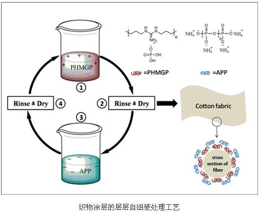 層層自組裝技術(shù)是近年來研究的熱點(diǎn),通過分別將帶有正負(fù)電荷的水性溶液,在織物等襯底上交替多次沉積,可形成納微米功能涂層,該技術(shù)具有工藝簡單易行、性能易于調(diào)控、環(huán)保無污染、適用面廣等特點(diǎn)。