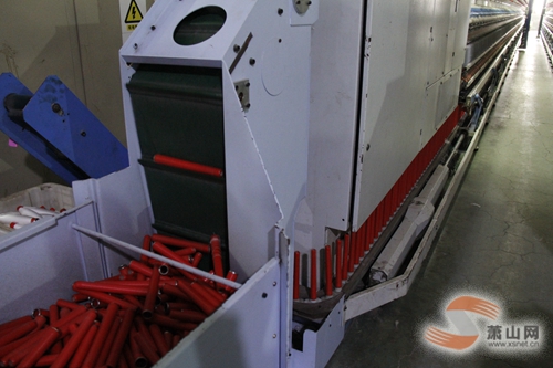 一筐紅色的空紗管放置在機(jī)器的這一頭,一根根空紗管像一個(gè)個(gè)聽話的孩子,自動(dòng)上了流水線,排隊(duì)、插管、紡紗、落紗……機(jī)器的那頭,一筐白色成品被一名工人搬了下來。在一片轟鳴的機(jī)器聲中,益南化纖提升理落紗自動(dòng)化工藝“機(jī)器換人”技改項(xiàng)目已投入在生產(chǎn)線上。