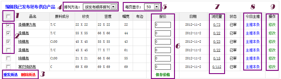 如圖: 1、此選擇框點擊之后可“全選”或者“全不選”當頁產品; 2、點選要操作的產品; 3、“重發(fā)”或“刪除”您第2項所選擇的產品; 4、更改編輯頁面中產品顯示的順序; 5、更改編輯頁面中產品顯示的條數(shù); 6、批量修改當前頁所有產品的報價,點擊“保存價格”后提交并生效; 7、顯示每一條產品的瀏覽量,斜線前面的數(shù)字為登錄會員瀏覽數(shù),斜線后面為全部瀏覽數(shù); 8、今日主推,在坯布現(xiàn)貨及其他相關欄目中主推的產品,“主推”或“取消主推”; 9、修改本條產品。 謝謝您的耐心觀看,我們會陸續(xù)推出更多實用的新功能,期待您對本網(wǎng)的繼續(xù)關注! 更多紡織專業(yè)資訊,關注錦橋紡織網(wǎng)微信公眾號。微信搜:錦橋紡織網(wǎng) 轉載本網(wǎng)專稿請注明:"本文轉自錦橋紡織網(wǎng)" |