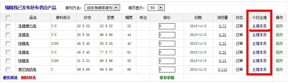 如果您還不知道如何選定這條“今日主推”產(chǎn)品,請(qǐng)繼續(xù)看下去: 主推產(chǎn)品的操作:如下圖,選擇您產(chǎn)品中要主推的一條,點(diǎn)擊此條產(chǎn)品后面的“主推本條”按鈕就可以了。