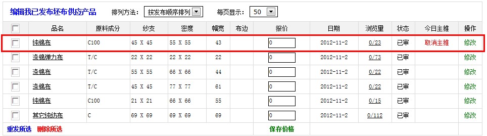 )打開的坯布供應(yīng)信息頁面,在沒有任何搜索條件的情況下顯示的是每個(gè)用戶一條的主推產(chǎn)品。如下圖