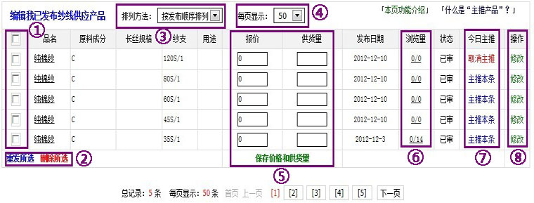 如圖: 1、此處上方的選擇框點(diǎn)擊之后可“全選”或者“全不選”當(dāng)頁產(chǎn)品,也可單獨(dú)點(diǎn)選其它要操作的產(chǎn)品; 2、可點(diǎn)擊“重發(fā)”或“刪除”您第①項(xiàng)所選擇的產(chǎn)品; 3、更改編輯頁面中產(chǎn)品顯示的順序; 4、更改編輯頁面中產(chǎn)品顯示的條數(shù); 5、批量修改當(dāng)前頁所有產(chǎn)品的報(bào)價(jià)和供貨量,點(diǎn)擊“保存價(jià)格和供貨量”后提交并生效; 6、顯示每一條產(chǎn)品的瀏覽量,斜線前面的數(shù)字為登錄會(huì)員瀏覽數(shù),斜線后面為全部瀏覽數(shù); 7、今日主推,在紗線現(xiàn)貨及其他相關(guān)欄目中主推的產(chǎn)品,“主推”或“取消主推”; 8、修改本條產(chǎn)品。 謝謝您的耐心觀看,我們會(huì)陸續(xù)推出更多實(shí)用的新功能,期待您對本網(wǎng)的繼續(xù)關(guān)注! 更多紡織專業(yè)資訊,關(guān)注錦橋紡織網(wǎng)微信公眾號。微信搜:錦橋紡織網(wǎng) 轉(zhuǎn)載本網(wǎng)專稿請注明:"本文轉(zhuǎn)自錦橋紡織網(wǎng)" |
